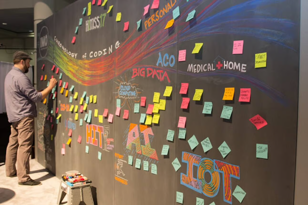 Intelligent Medical Objects used a 25-foot chalkboard to display the history of clinical coding. Throughout the event, an artist was adding to the designs, and invited attendees to contribute. Photo: Kayla Hernandez for BizBash